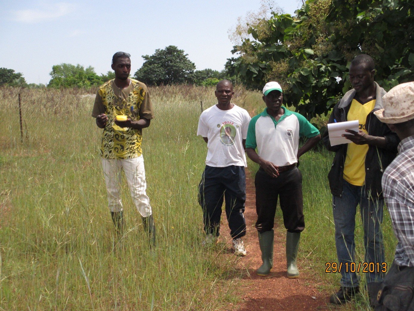 Facilitate the delimitation of land tenure rights and village-level "chartes foncières," (signed community land use plans that conform with the current land tenure laws of Burkina Faso): Nikiegnounou Gnoumou leading the team responsible for measuring and documenting the historic ownership of the fields adjacent to the Tengrela Lake (commune of Banfora). The men with traditional land claims to this particular plot of land are standing to his left (in white shirts). This activity was supported by the USG-funded Land Tenure Project supported by MCA/BF. (Source: ACSD photo archive)