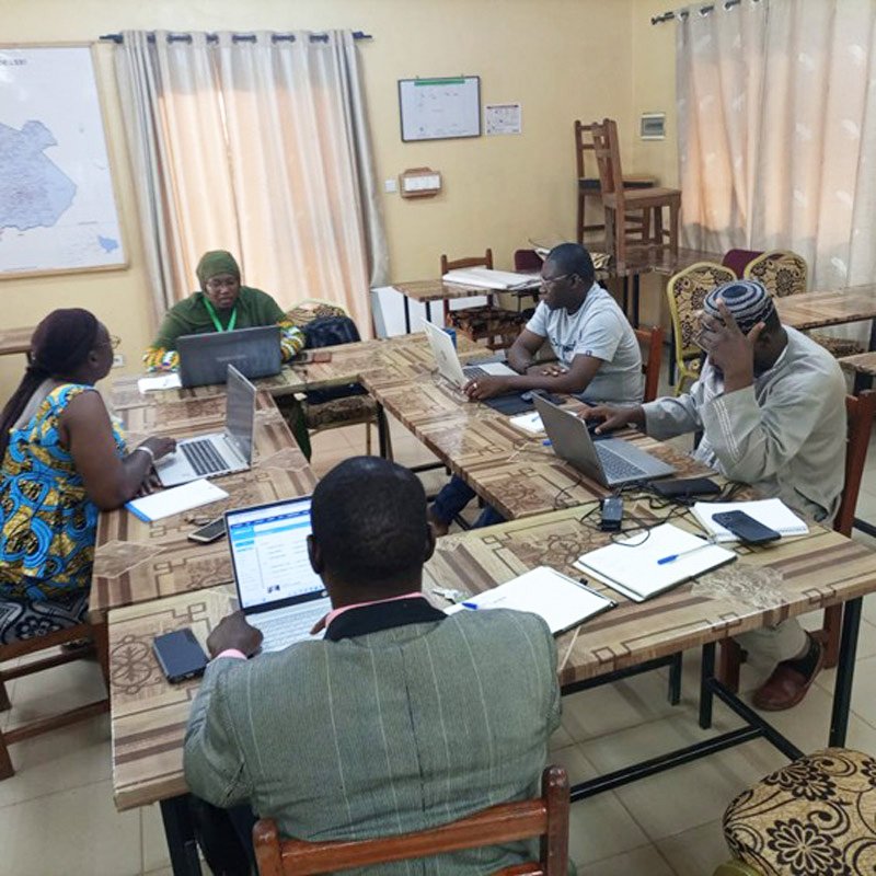 LCaps focal point Ky Aida Sarah conducting the OCA survey with the headquarters staff of the “Organisation Catholique pour le Développement et la Solidarité” (OCADES) in October 2024. (Source: ACSD photo archive)